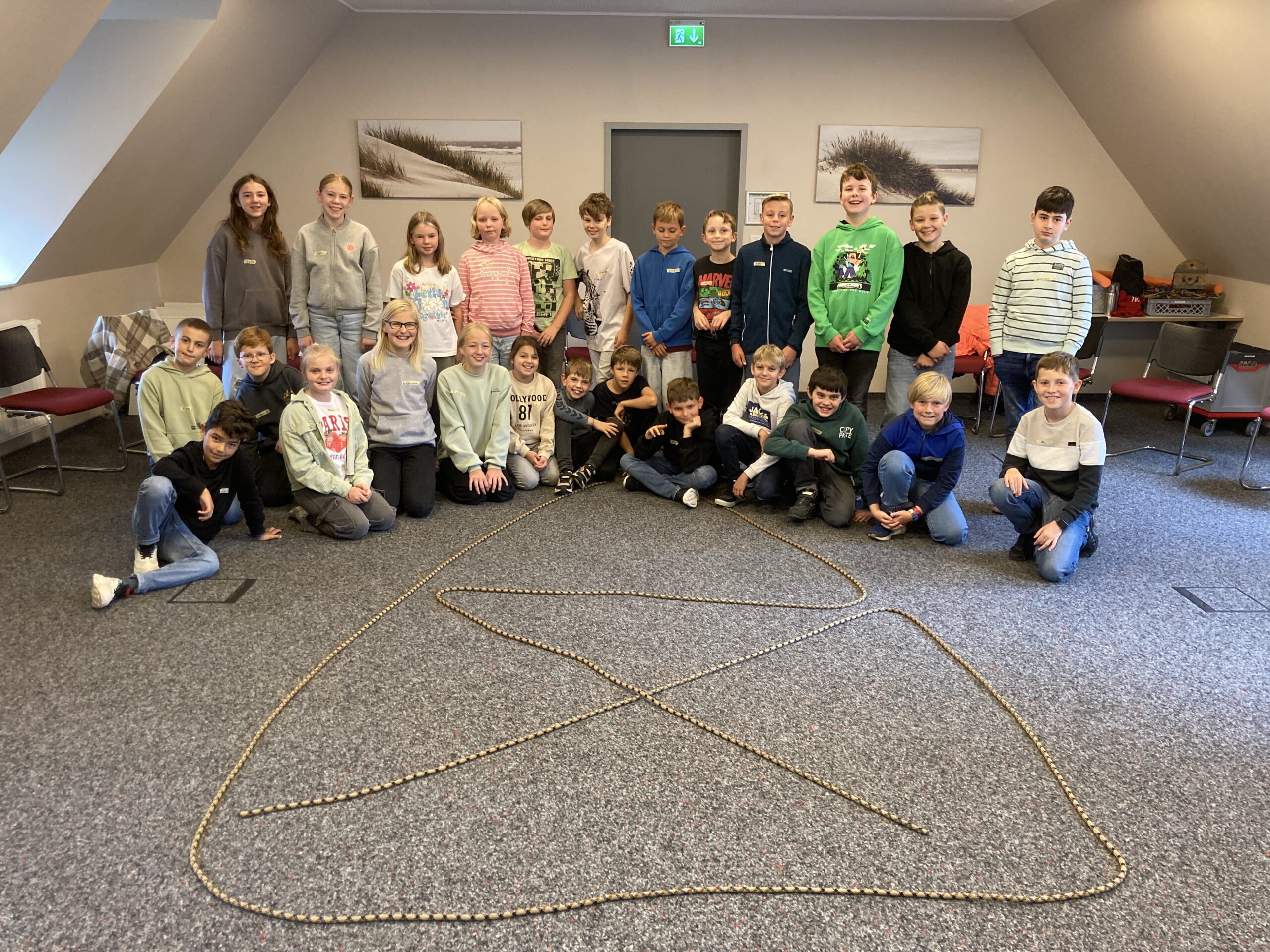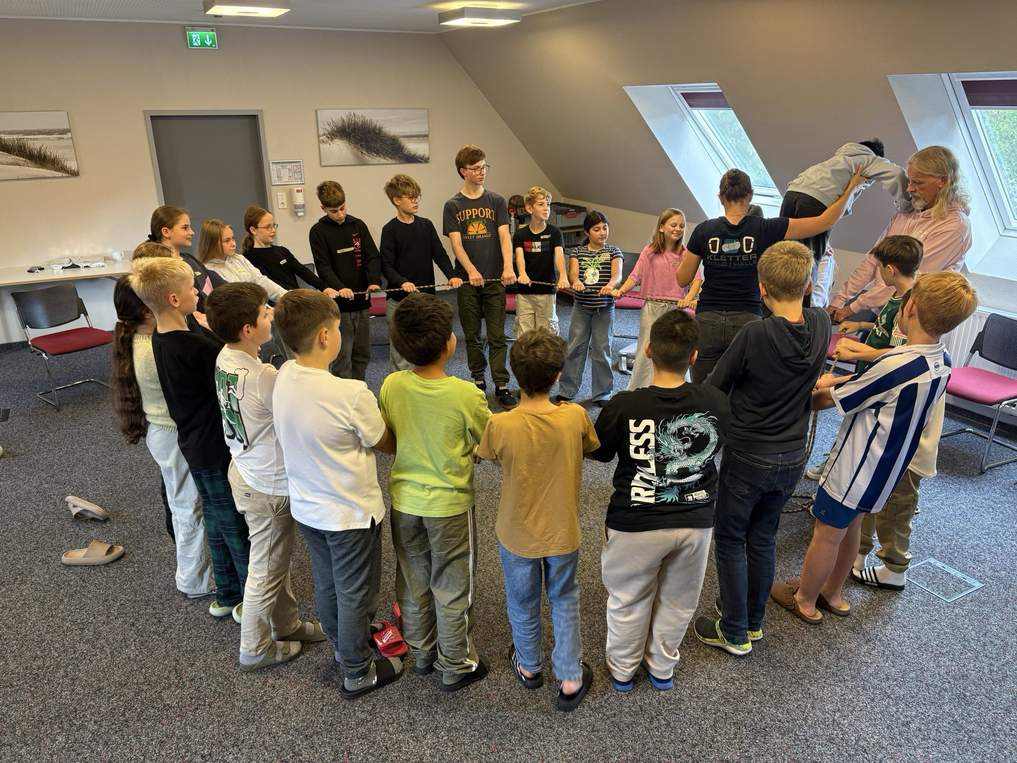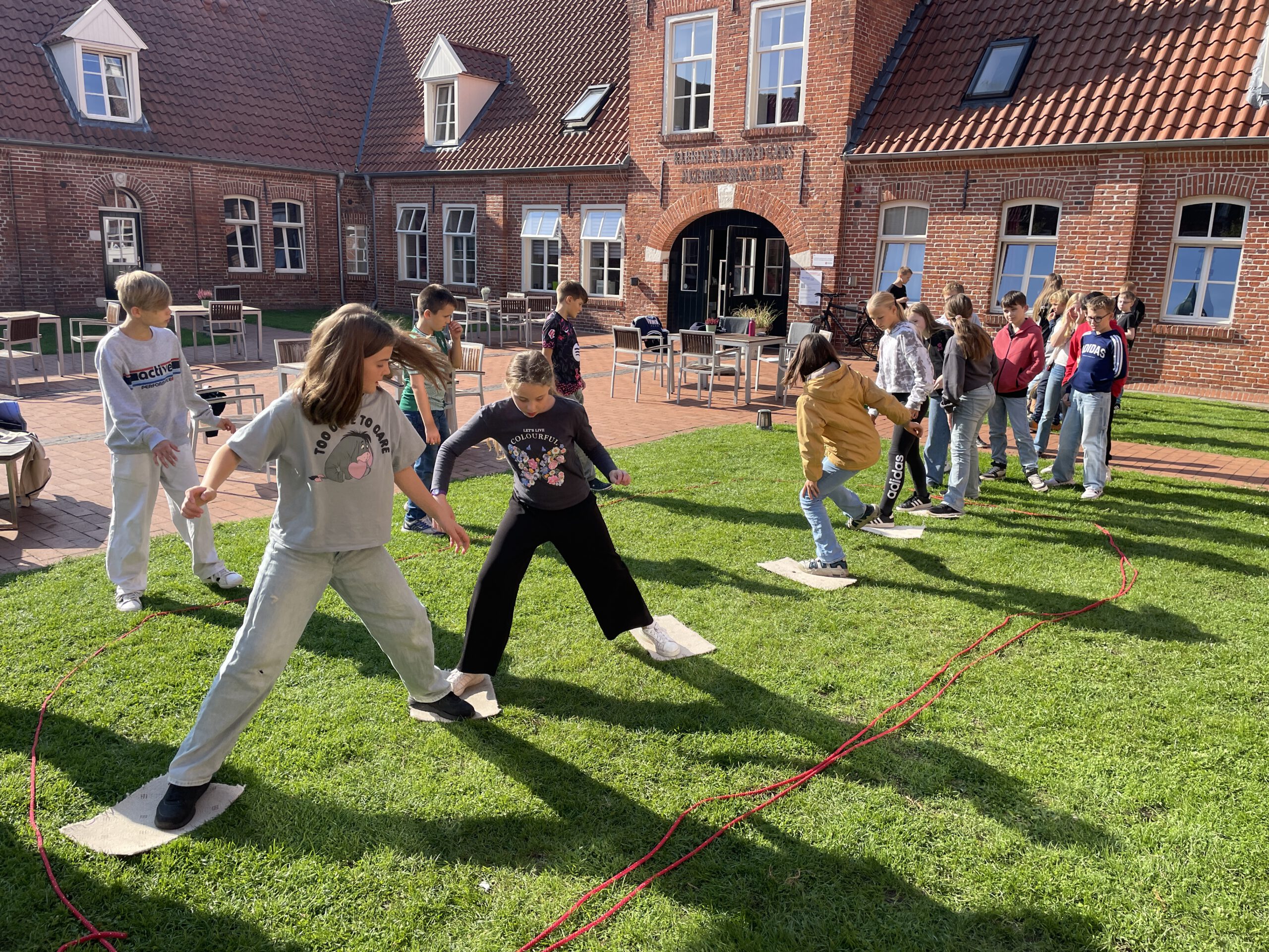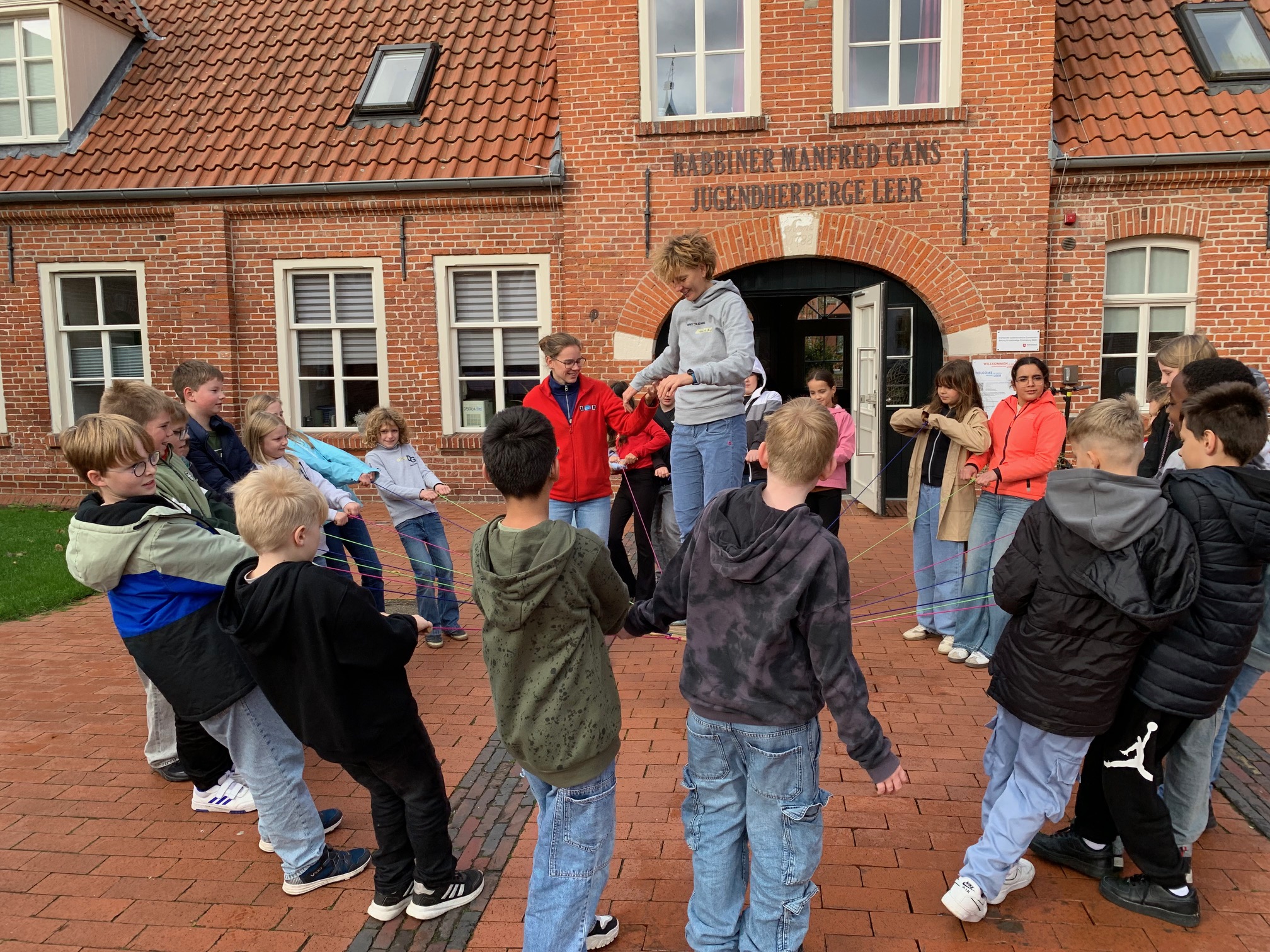Unsere 6 Klassen des 5. Jahrgangs machten sich zu unterschiedlichen Zeiten im September und Oktober auf den Weg zur Jugendherberge in Leer. Einmal im Jahr findet dort die Kennenlernzeit außerhalb des schulischen Alltags statt. Alle Klassen verbringen dann 2,5 Tage zusammen, um sich untereinander näher kennenzulernen und auf unterschiedliche Art und Weise die Klassengemeinschaft zu stärken. Letzteres erfolgte dieses Jahr durch Anleitung von Jana vom Kletterpark Werlte „Abenteuerzeit“, die spielerisch die Zusammenarbeit der SchülerInnen auf die Probe stellte und deren Kooperation stärkte. So wurde gemeinsam das Haus vom Nikolaus auf Zeit gebaut oder mit vereinter Muskelkraft die Lehrerin schweben gelassen.