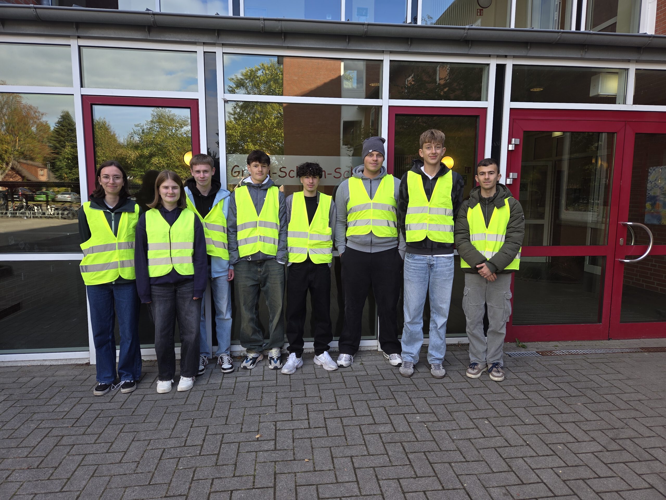 Am Freitag, dem 26.09.25, gingen wir, sechs Schüler:innen aus dem rk1E-Kurs, zur Greta-Schoon-Schule, um sie beim Herbstlauf zu unterstützen. Mit Fahrrädern ging es für uns los zu den Streckenposten. In diesen Posten haben wir darauf aufgepasst, dass alle Kinder auf dem richtigen Weg bleiben.