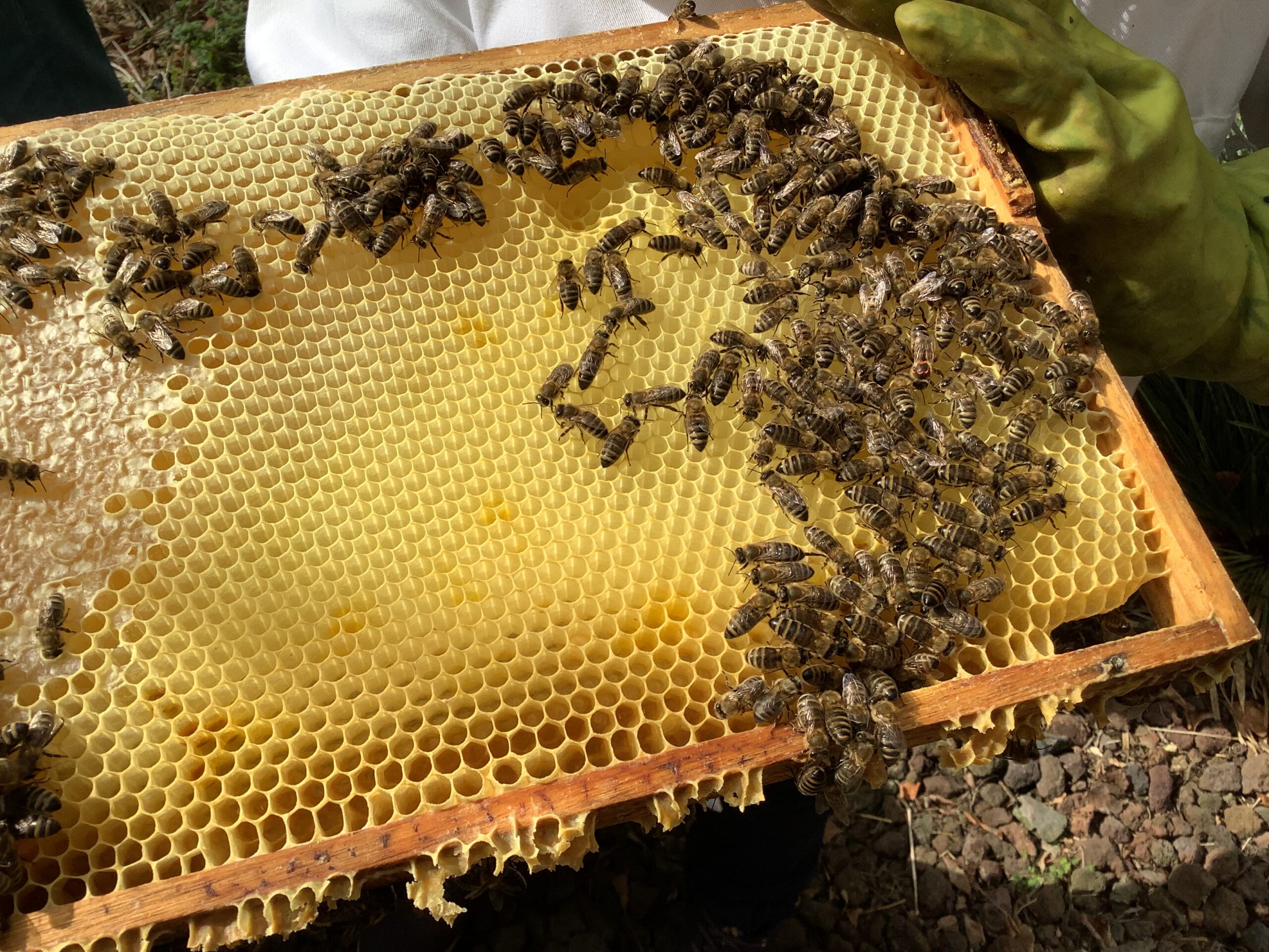 In diesem Jahr haben wir eine neue Beute aus Holz gebaut. Diese Beute hat ein Sichtfenster, so dass man das Volk vom Foyer aus beobachten kann. Im Frühjahr bildeten wir aus unseren Völkern ein neues Volk, das dann in die neue Beute eingezogen ist. Im Frühjahr haben wir auch unseren Honig auf besondere Inhalte untersucht, wir fanden bis auf Pollen nichts Besonderes.