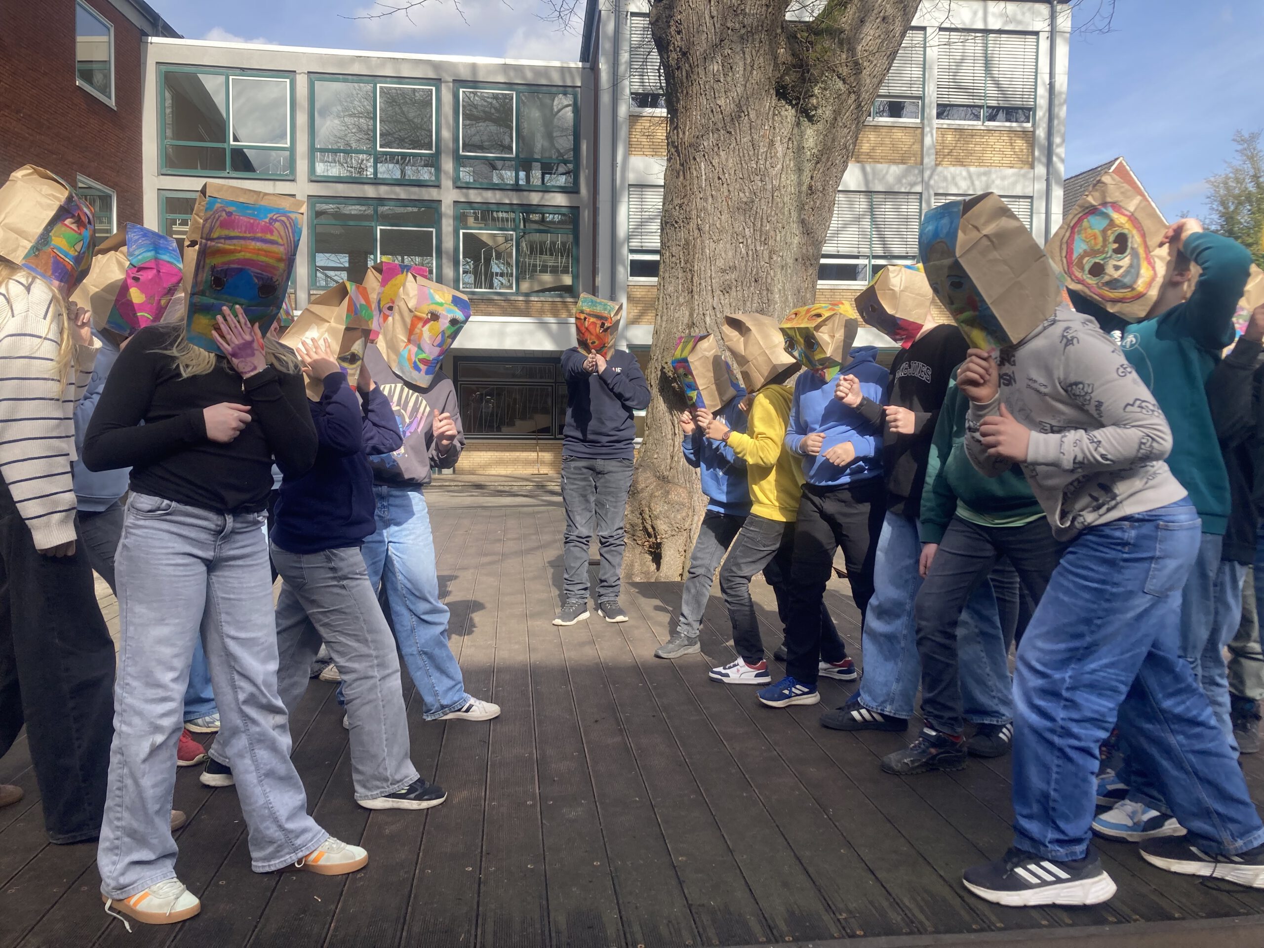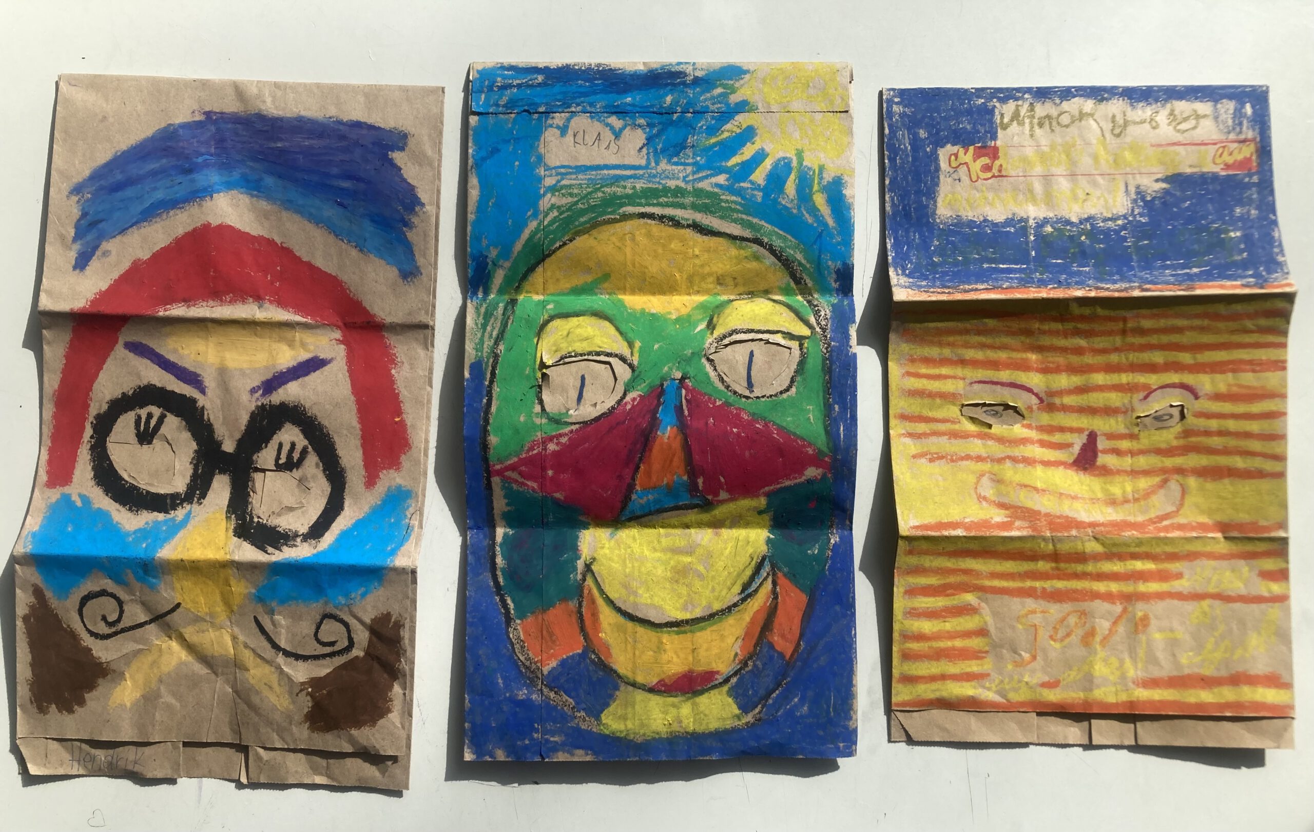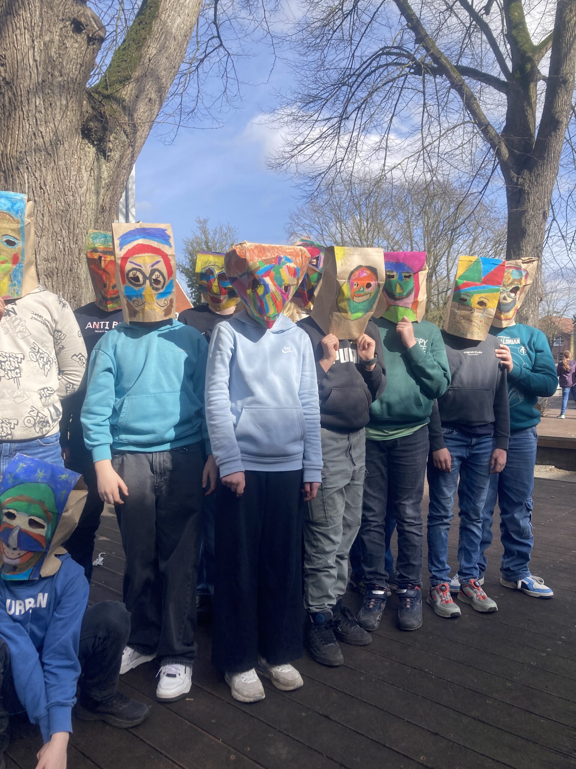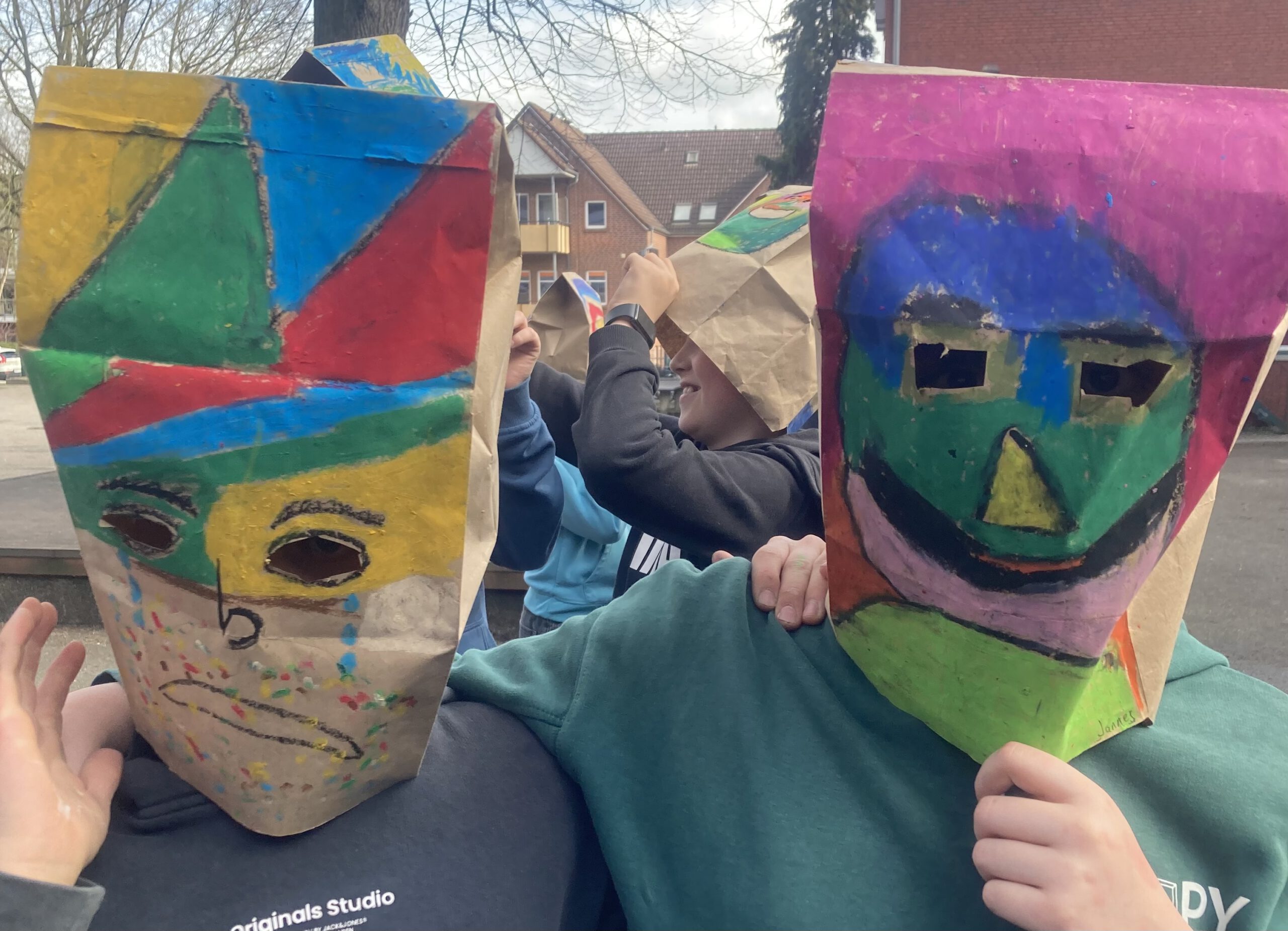 Die Klasse 5a hat sich im Kunstunterricht mit Porträtdarstellungen von Alexij v. Jawlensky beschäftigt. Dabei spielten die Kunstepoche Expressionismus und die damit verbundenen leuchtenden, gesteigerten Farben und die Abstraktion eine besondere Rolle. Damit Bilder nicht nur auf dem zweidimensionalen Papier entstehen, wurden die abstrakten Porträts von den SchülerInnen auf Papiertüten mit Ölpastellkreiden gemalt. Anschließend wurden sie durch das Aufsetzen „lebendig“. Die Klasse hatte ihre Freude beim Ausprobieren und Interagieren. Eine weitere wichtige Erfahrung war, vorsichtig, feinmotorisch die Löcher für die Augen in die Tüten reinzuschneiden und die Papiertüte auch im Prozess des Malens so zu behandeln, dass sie nicht zerreißt.