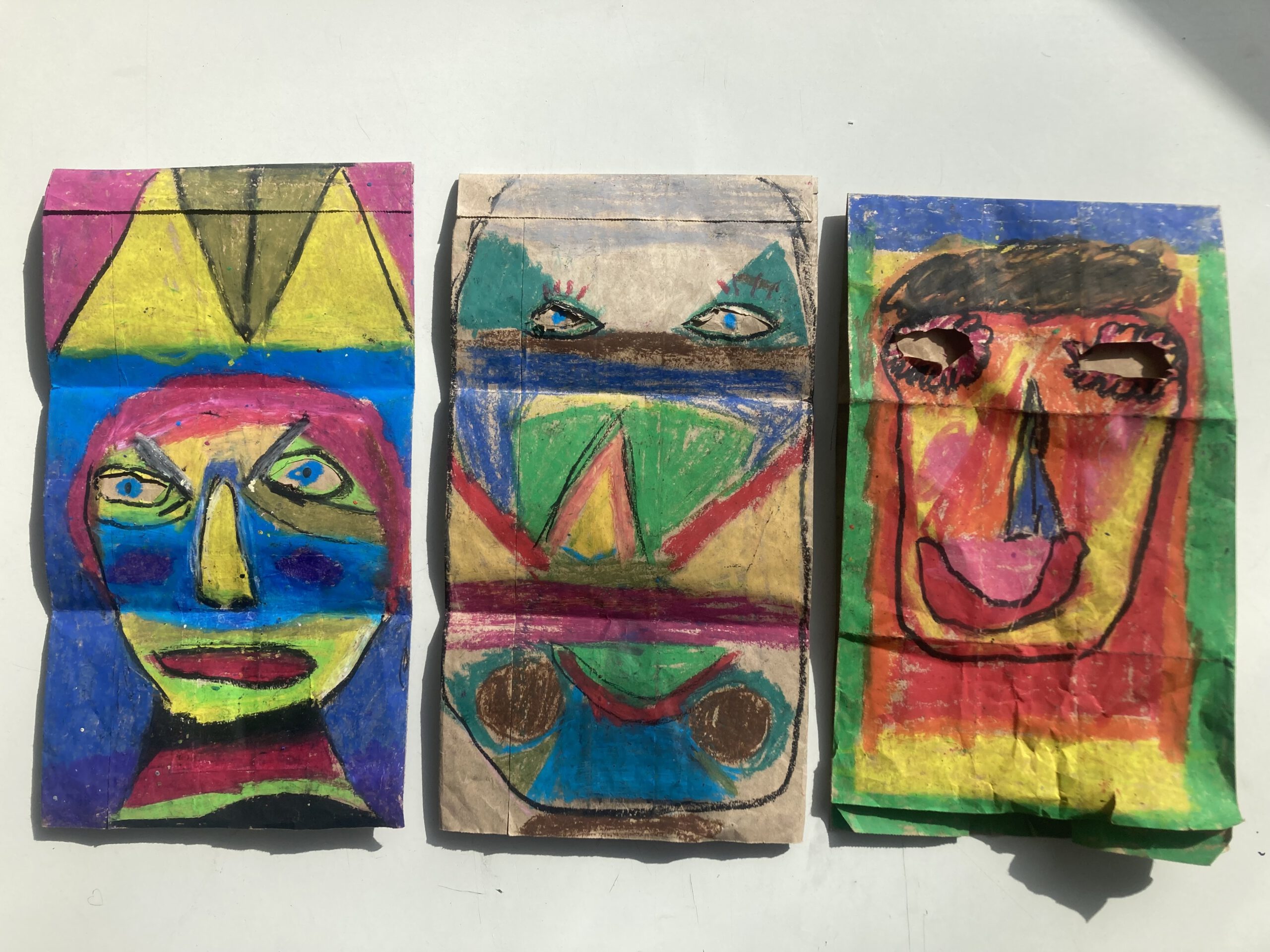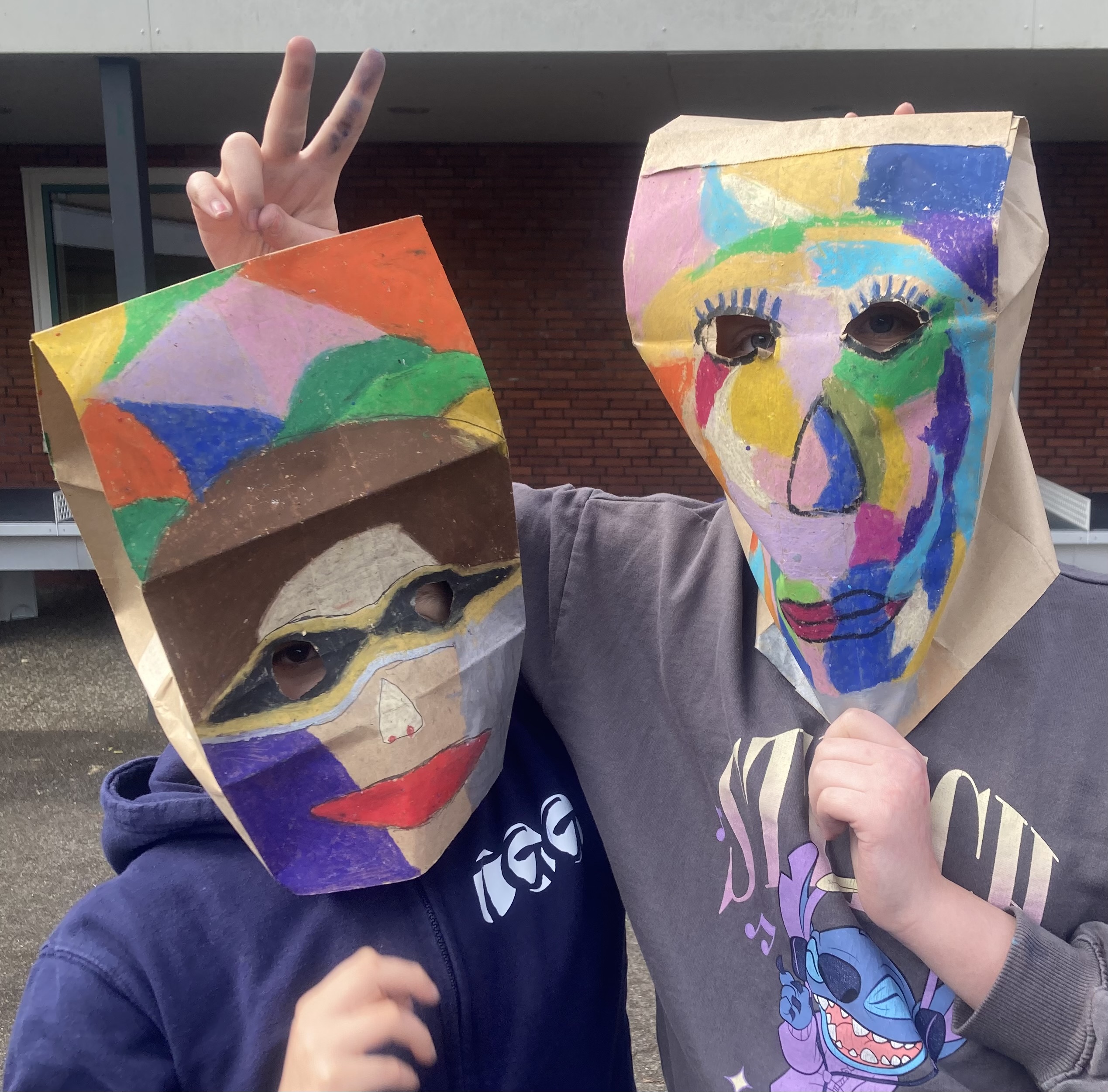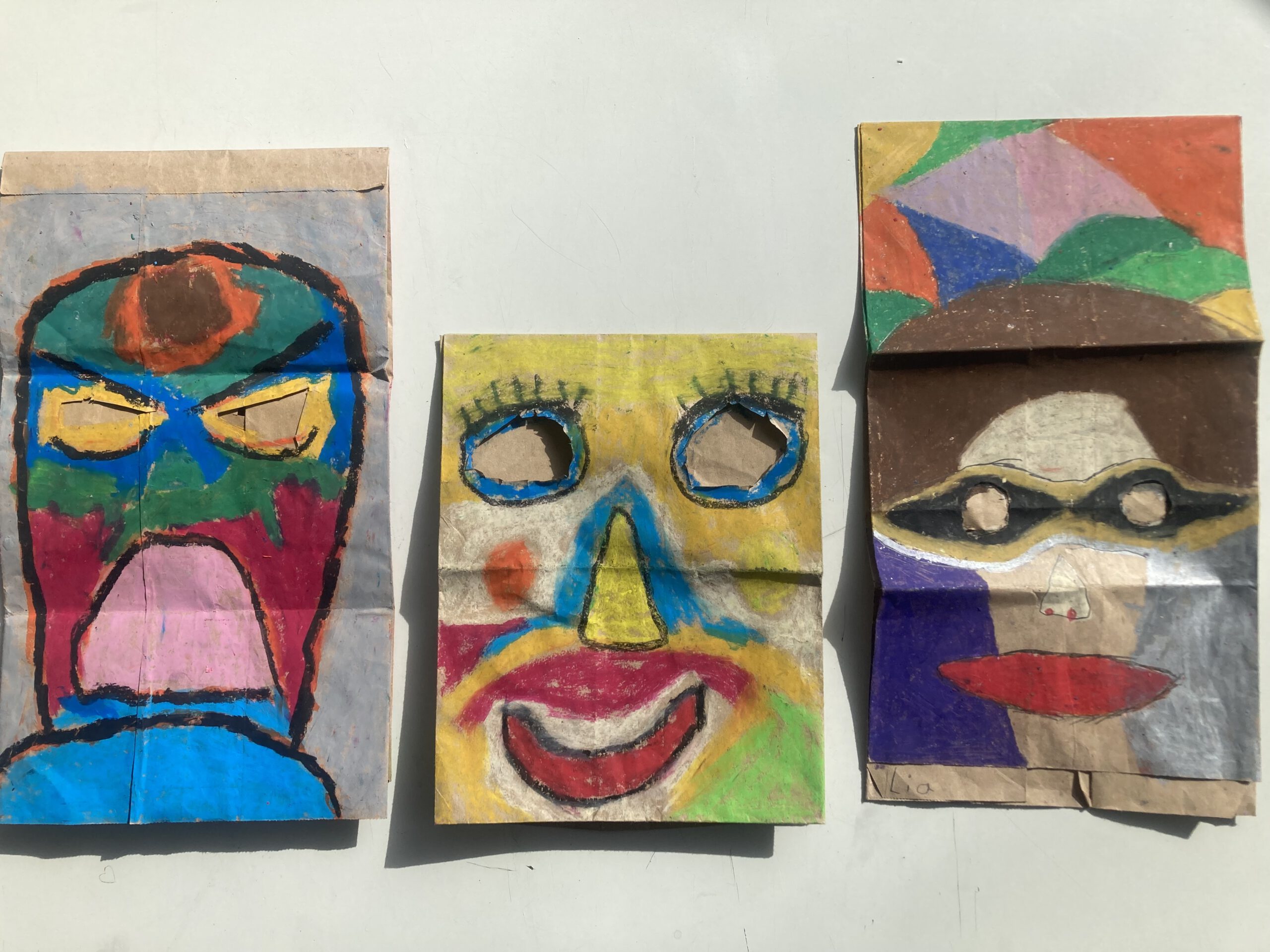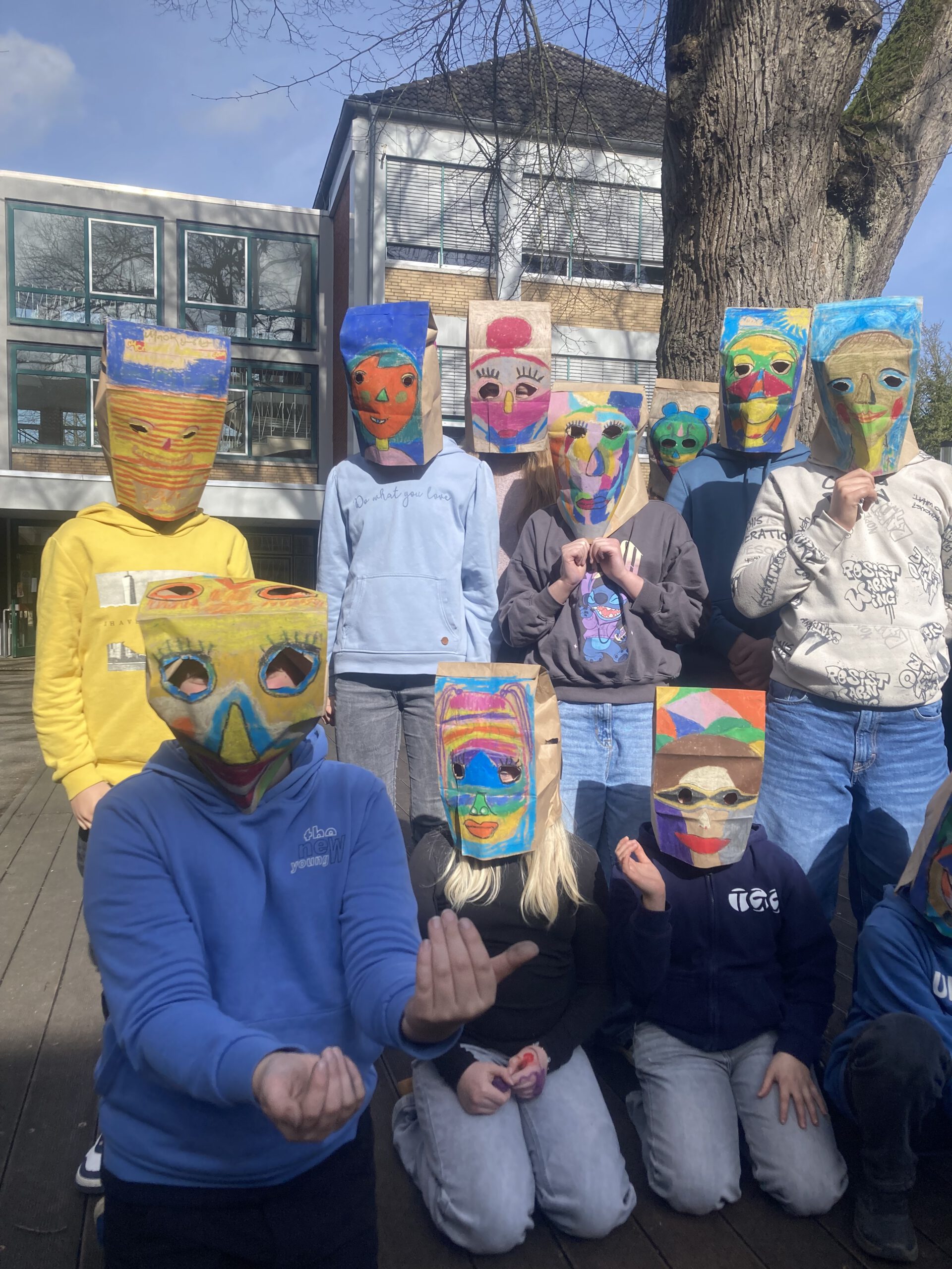 Die Klasse 5a hat sich im Kunstunterricht mit Porträtdarstellungen von Alexij v. Jawlensky beschäftigt. Dabei spielten die Kunstepoche Expressionismus und die damit verbundenen leuchtenden, gesteigerten Farben und die Abstraktion eine besondere Rolle. Damit Bilder nicht nur auf dem zweidimensionalen Papier entstehen, wurden die abstrakten Porträts von den SchülerInnen auf Papiertüten mit Ölpastellkreiden gemalt. Anschließend wurden sie durch das Aufsetzen „lebendig“. Die Klasse hatte ihre Freude beim Ausprobieren und Interagieren. Eine weitere wichtige Erfahrung war, vorsichtig, feinmotorisch die Löcher für die Augen in die Tüten reinzuschneiden und die Papiertüte auch im Prozess des Malens so zu behandeln, dass sie nicht zerreißt.