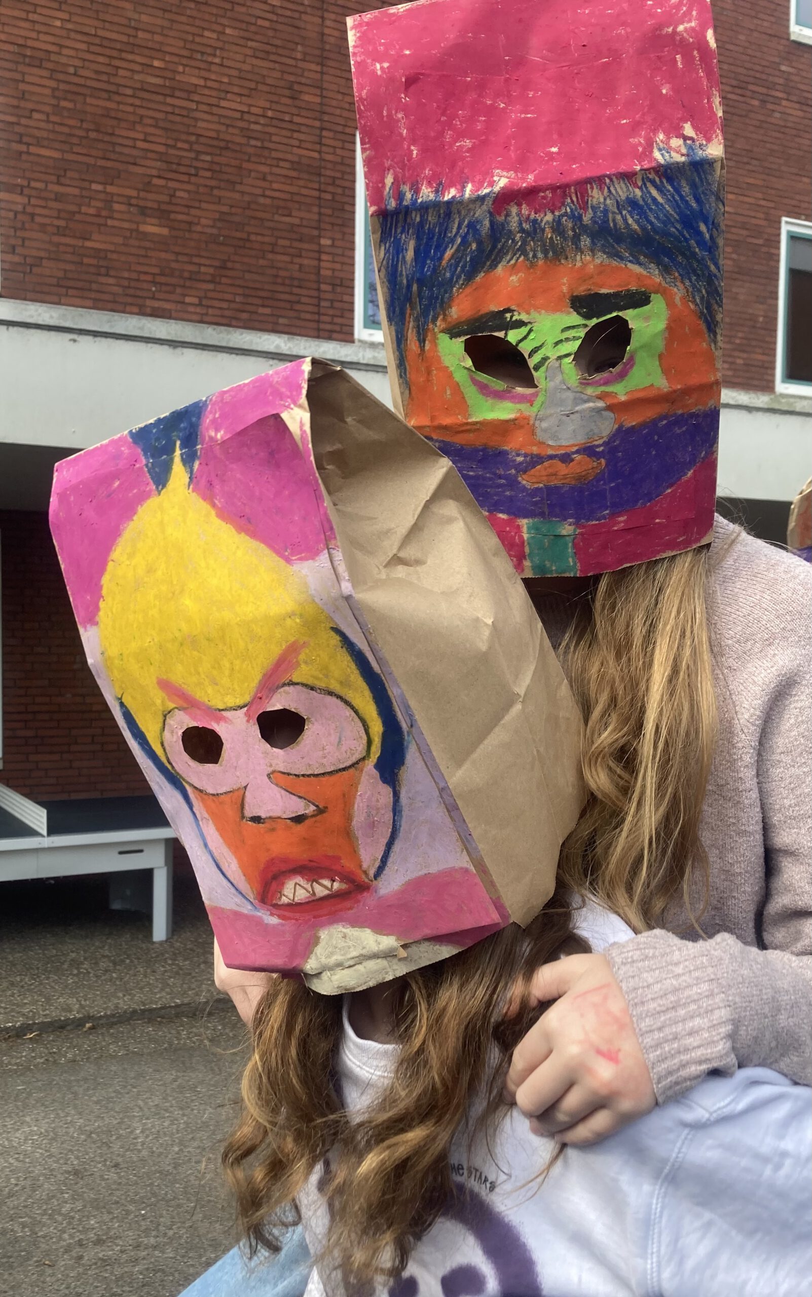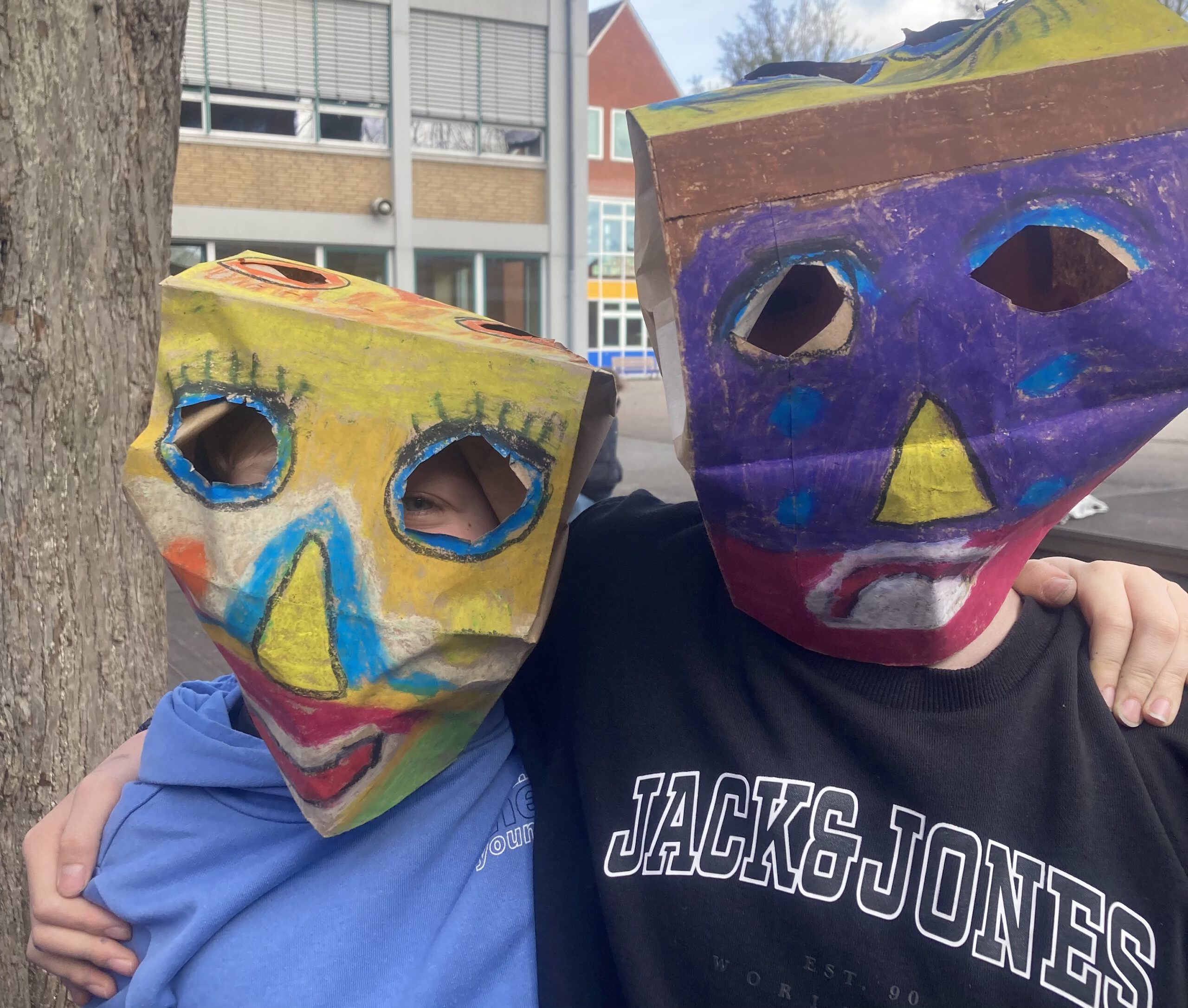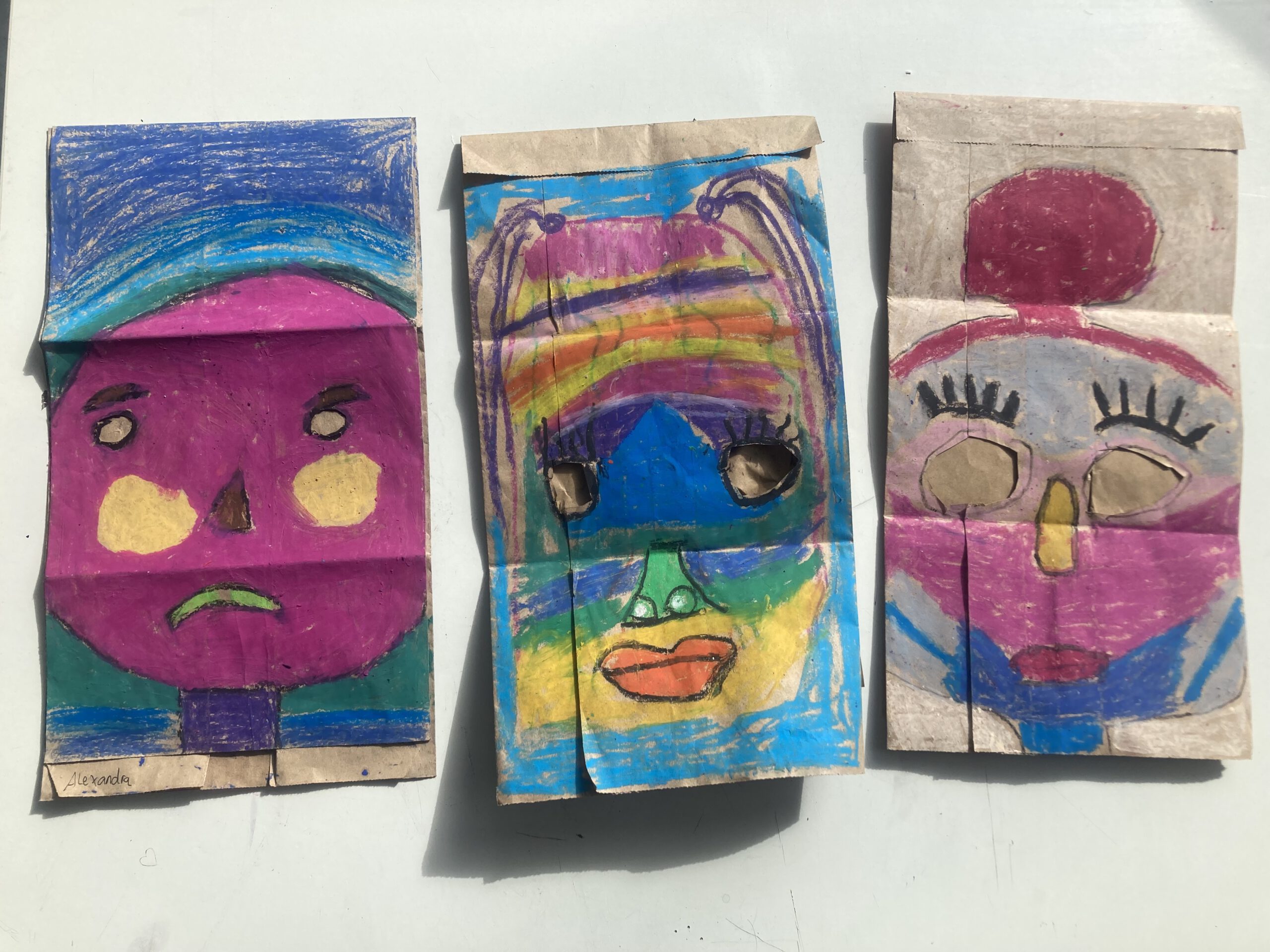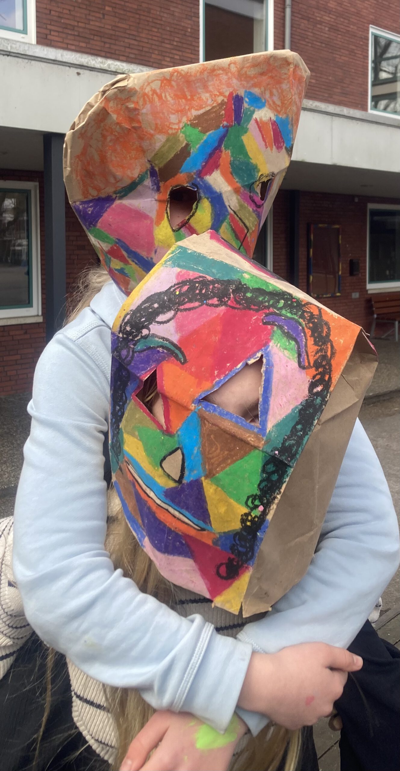 Die Klasse 5a hat sich im Kunstunterricht mit Porträtdarstellungen von Alexij v. Jawlensky beschäftigt. Dabei spielten die Kunstepoche Expressionismus und die damit verbundenen leuchtenden, gesteigerten Farben und die Abstraktion eine besondere Rolle. Damit Bilder nicht nur auf dem zweidimensionalen Papier entstehen, wurden die abstrakten Porträts von den SchülerInnen auf Papiertüten mit Ölpastellkreiden gemalt. Anschließend wurden sie durch das Aufsetzen „lebendig“. Die Klasse hatte ihre Freude beim Ausprobieren und Interagieren. Eine weitere wichtige Erfahrung war, vorsichtig, feinmotorisch die Löcher für die Augen in die Tüten reinzuschneiden und die Papiertüte auch im Prozess des Malens so zu behandeln, dass sie nicht zerreißt.