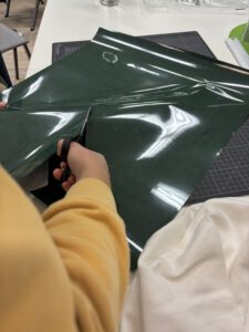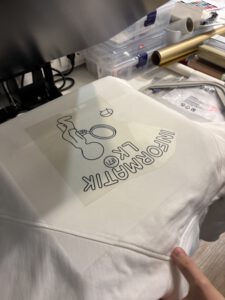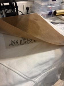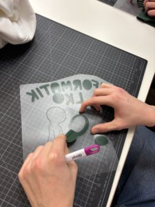 Beim Bedrucken der Pullover pressten wir diese zunächst mit einer Heizpresse, um den Stoff zu glätten und mögliche Bakterien zu beseitigen. Währenddessen plotteten wir die Logos auf eine spezielle Folie. Anschließend bestand unsere Aufgabe darin, die Folie so abzuziehen, dass am Ende nur noch das eigentliche Logo sichtbar war. Danach konnte der Textildruck beginnen. Wir richteten das Logo auf dem Pullover aus und pressten es schließlich erneut, sodass es dauerhaft auf dem Stoff haftete.