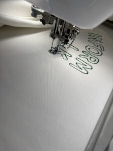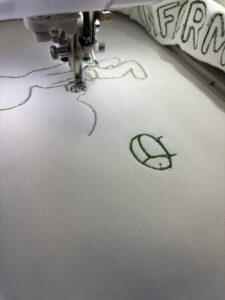 Beim Sticken bestand die erste Herausforderung darin, den Pullover exakt in den Rahmen einzuspannen. Nachdem dies gelungen war, übernahm die Stickmaschine den Großteil der weiteren Arbeit.