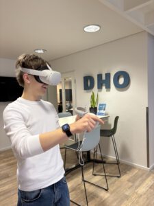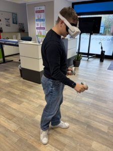 Nachdem alle Pullover fertiggestellt waren, hatten wir zudem die Möglichkeit, mithilfe einer VRBrille in eine virtuelle Welt einzutauchen. Dabei konnten wir unter anderem Zahlenfolgen vervollständigen, Metalle schweißen oder einen Asphaltfertiger fahren.